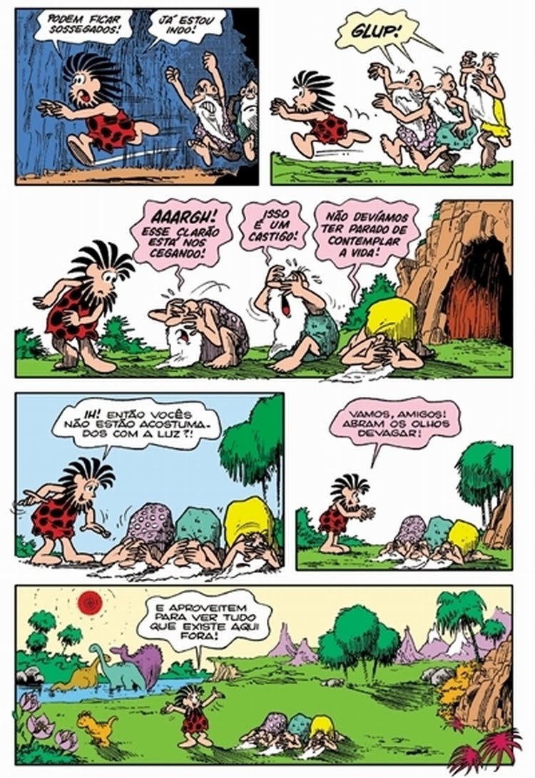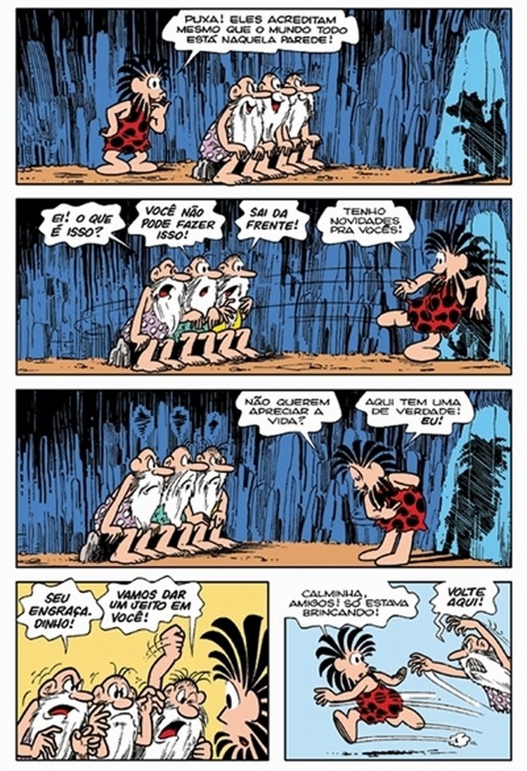 Como a adaptação e sátira da Alegoria da Caverna feita por Maurício de Souza é inteligente e magistral, merece ser vista. Para melhor visualizá-la o leitor poderá acessar este link: http://www.monica.com.br/comics/piteco/pag1.htm