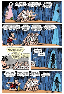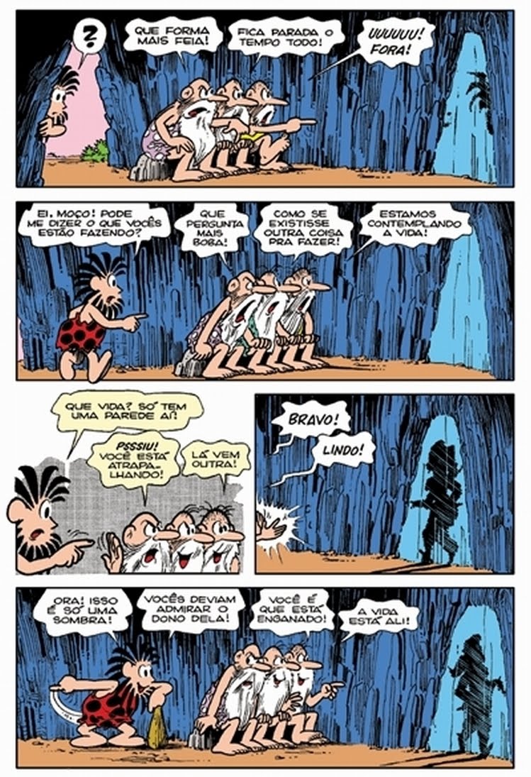 Ocorre, porém, que nos quadrinho do Maurício ele compara a metáfora de Platão com os dias atuais, em que as pessoas ficam presas às idéias pré-urdidas, achando que são as únicas realidades existentes, onde a TV funciona como o fundo da caverna; só que em vez de receber as imagens projetadas ela é que projeta nas mentes das pessoas, toda sorte de desinformações, banalidades, propagandas ideológicas subliminares, incitação ao consumo de bens supérfluos, ditando modas e costumes, músicas (se é que podemos chamar de músicas) com letras de baixarias, novelas com maus exemplos de comportamento social; enfim, de coisas que até diabo se incomoda ou tem nojo. Não existem muitos programas inteligentes que divertem e educam.